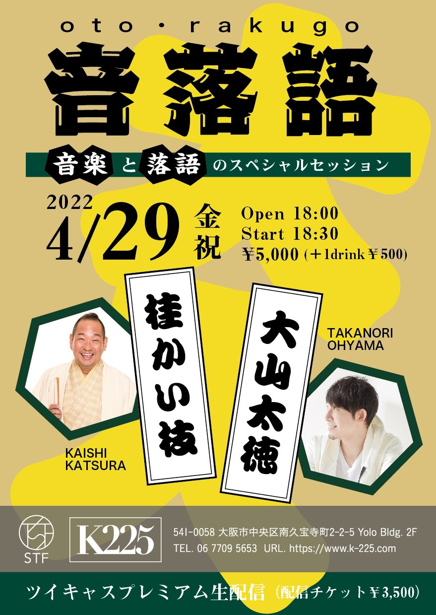 30日 4月 2022 音楽と落語のスペシャルセッション!【音落語】開催 人気落語家 桂かい枝さんとのコラボ企画!! 【音落語】音楽と落語のスペシャルセッション 大好評にて終了いたしました! tagPlaceholderカテゴリ: コメントをお書きください コメント: 0